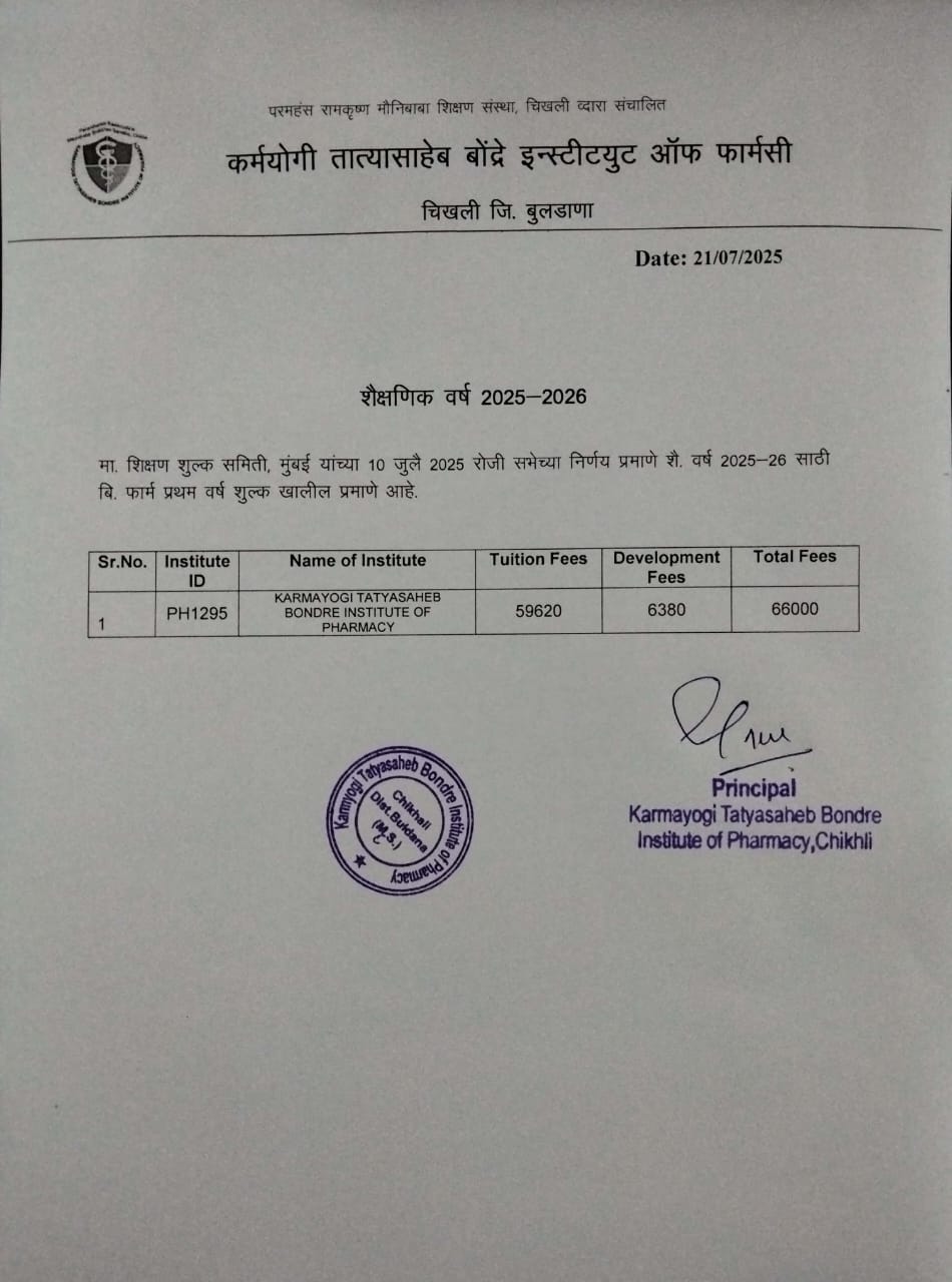 The institute is a dream of our founder Chairman Shri Siddhavinayakji K. Bondre realized by the blessings of Sant Paramhansa Ramkrishna Maunibaba. The institute was established in the year 2019 with a degree in pharmacy course, and diploma in pharmacy in 2023.